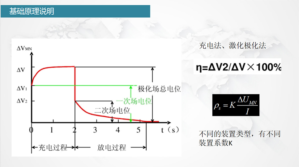 主动源电法勘探与被动源电法不同,需人工向地下发射稳定的场源,仪器再接收到发射源的变化,来计算视电阻率、激化率等物理参数,根据勘查目标物与围岩存在的电阻率、激化率等物理参数变化来判别勘查目标物的深度、走向及储量等信息。在使用过程中,一般通过A和B两个电极向地下供电,仪器通过M、N输入来测量不同位置的电位差,根据 η=∆V2/∆V*100% 来计算视电阻率,其中K为装系数,通过ρs=K (∆UMN)/I) 来计算激化率。